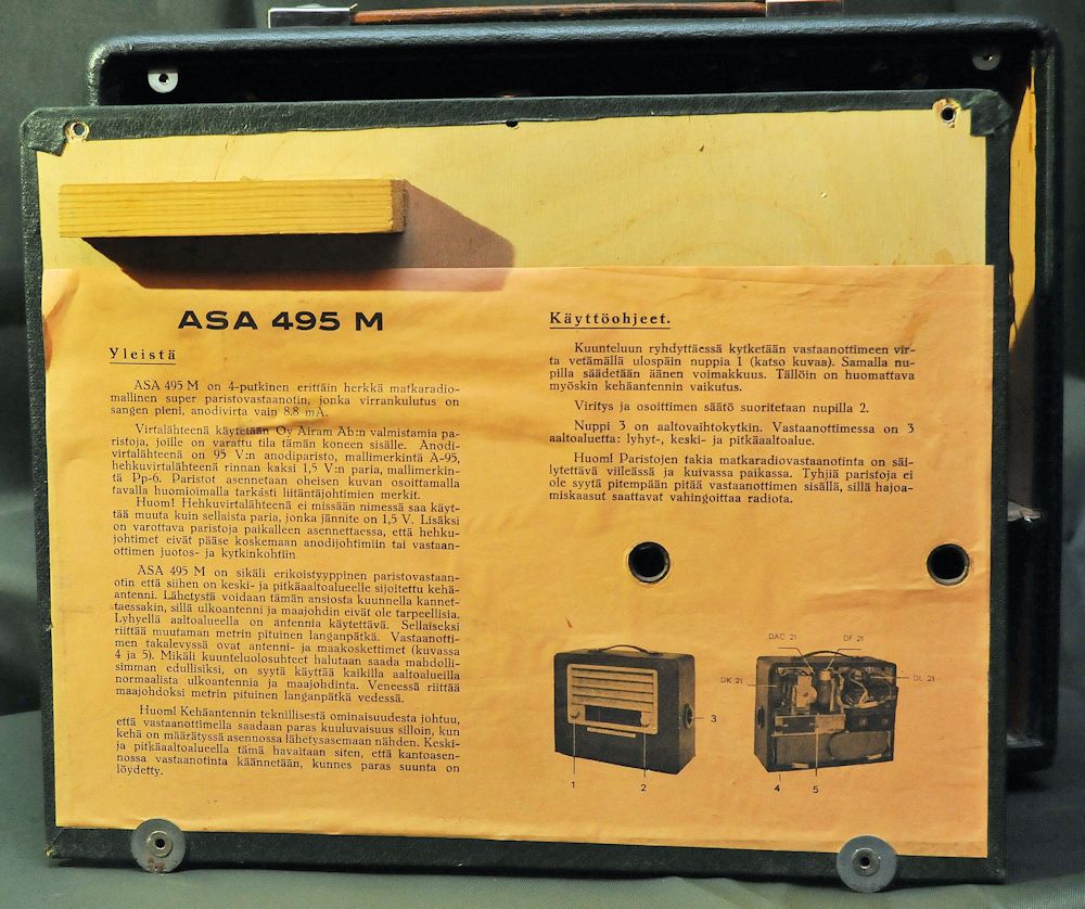 4- putkinen superheterodyne paristomatkavastaanotin. Anodijännite: 95 V anodiparisto, Hehkujännite: rinnan kaksi 1.5 V:n paria. Anodivirta: 8.8 mA. Aaltoalueet: 17-50 m, 193-587 m, 673-2000 m. Putket: DK 21, DAC 21, DF 21, DL 21. PM: M1-8.